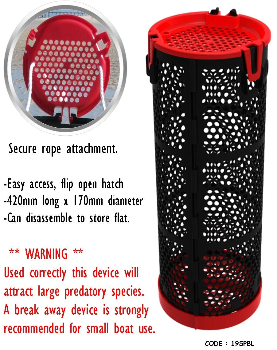 Designed and made in Australia the ‘Seadog’ berley pot is very functional and easy to use. The pot is surrounded by 8mm holes which allow an even flow of berley, has a positive locking lid, comes supplied with 1.5 metres of rope and can accommodate different weights to suit varying tidal conditions.  Manufactured from super tough UV resistant polyethylene material in a 9 litre size, the ‘Seadog’ berley pot will accommodate all sorts of berley, dry, wet or frozen. Perfect for 2 and 3kg frozen berley logs.